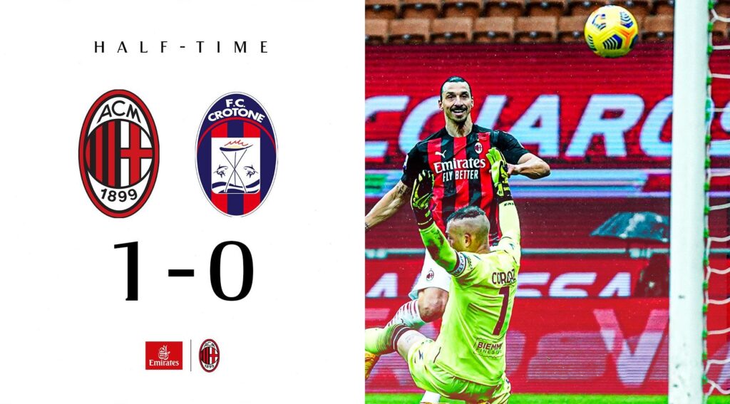 In un match molto equilibrato allora, per sbloccare il risultato ci vuole la giocata personale di un grande campione: Zlatan Ibrahimovic. AL 30′ lo svedese scambia in area con Leao, e dal lato sinistro dell’area piccola, scaglia alle spalle di Cordaz il gol numero 500 in carriera, riscattando subito l’errore dal dischetto di Bologna. Anche dopo il vantaggio rossonero però, i binari della partita non cambiano. Il Crotone attutisce subito il colpo, e continua a provare a rendersi pericoloso. Anche se i tentativi rossoblu, non preoccupano mai sul serio Donnarumma, così il primo tempo si conclude sul risultato di 1-0.
